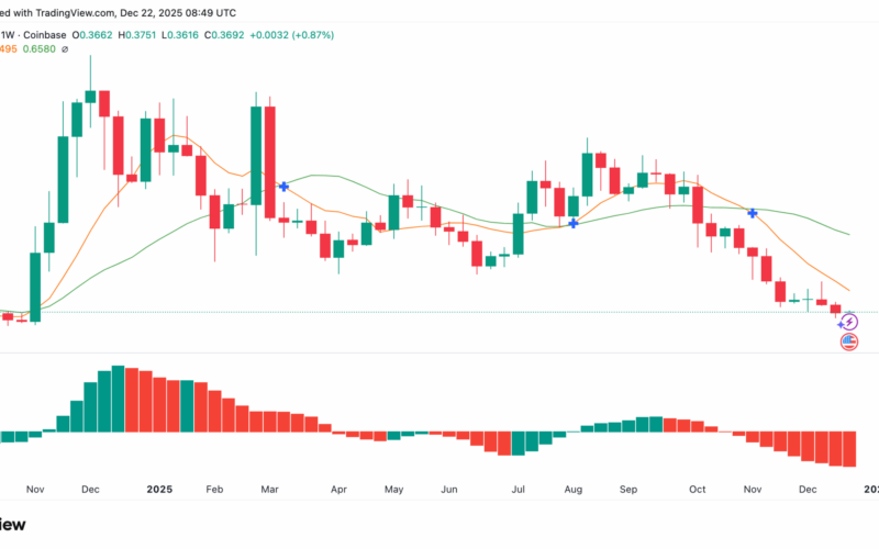 Cardano (ADA) has come under renewed pressure as key technical signals point to continued weakness. The asset is trading at around $0.37, with a market cap of $13.6 billion. Its 24-hour trading volume stands at $576 million. Over the past seven days, ADA has fallen by almost 9%, adding to a larger drawdown seen in recent weeks.