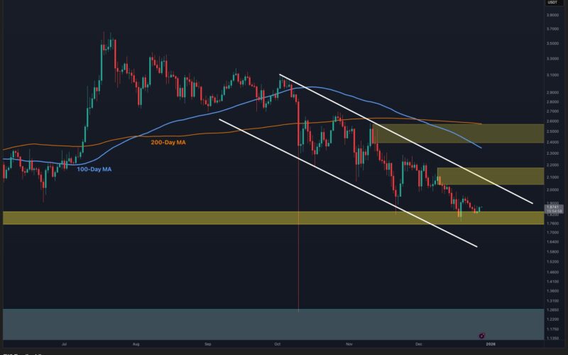 On the daily timeframe, XRP continues to trade within a well-defined descending channel that has been respected since the major breakdown earlier in the trend. The asset is currently hovering just above a key demand zone around the $1.80 area, which has acted as a buyer’s base during recent pullbacks. Despite this support holding for now, the overall structure remains weak, as XRP is still capped below the descending trendline and remains under both the 100-day and 200-day moving averages.