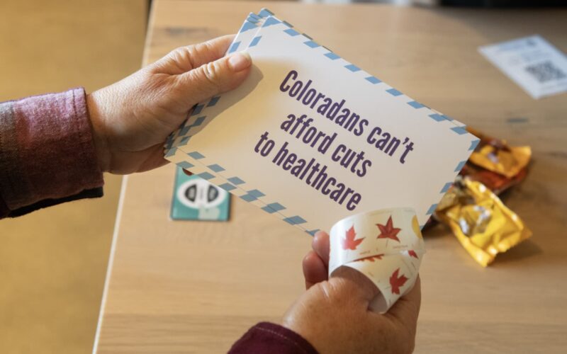 Colorado residents fill out cards and share their stories for content to send to congressional representatives regarding health-care cuts on Nov. 1, 2025, the first day of ACA open enrollment, in Northglenn, Colorado.