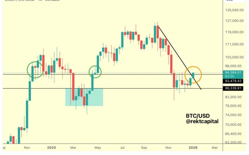 Bitcoin has rebounded from the lower end of its weekly range near $86,200. This level has acted as a support area in the past. The price has now climbed to test the top of this range near $93,500. Analyst Rekt Capital pointed out that a close above this level would mark a potential breakout. The asset is currently trading above the range high, but the weekly close will be crucial.