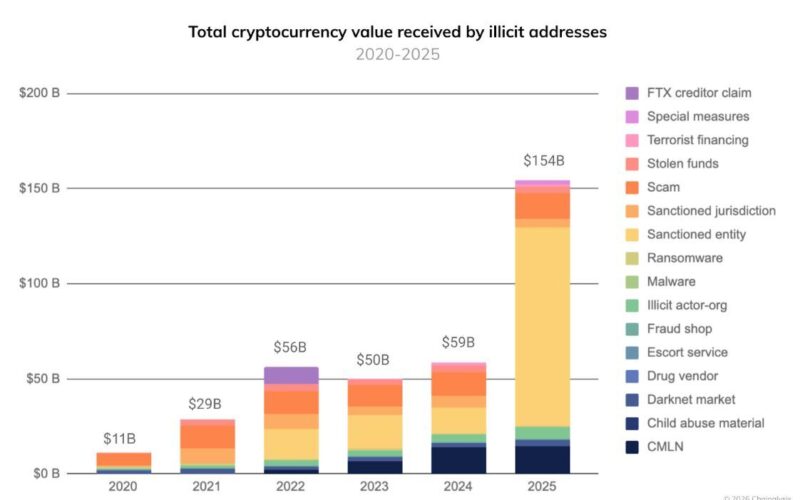 Illicit cryptocurrency activity surged to record levels in 2025, as criminal-linked addresses received at least $154 billion over the year.