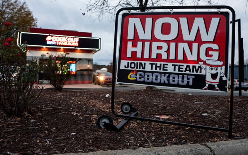 A “Now Hiring” sign at a Cookout fast-food restaurant on November 25, 2025 in Durham, North Carolina.