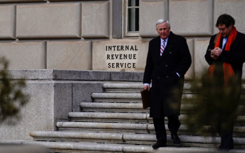 People exit the the U.S. Internal Revenue Service (IRS) building in Washington, D.C., on Feb. 20, 2025.