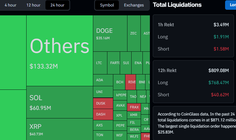 Somewhat expected, the liquidations are on the rise, with over $870 million wrecked in the past 24 hours. Naturally, longs are responsible for the lion’s share (nearly $790 million). The total number of liquidated traders has skyrocketed to just shy of 250,000, according to data from CoinGlass.