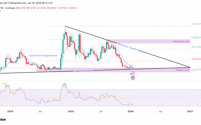 Currently, ADA is moving along the bottom edge of a symmetrical triangle that has been forming on the weekly chart. It is trading just above the $0.36 mark, which is part of a long-tested support zone ranging down to $0.28. A break below this level could push the token toward $0.27.