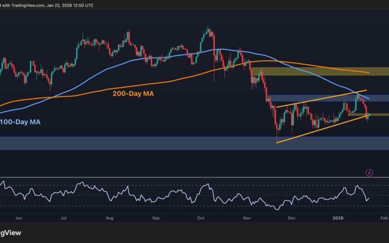 On the daily chart, BTC has been rejected from the $95,000–$97,000 resistance band and the declining 100-day moving average, which converged with the upper boundary of the recent rising channel. That rejection has pushed the price back toward the $90,000 support area, which coincides with the lower channel boundary and the origin of the most recent leg higher.