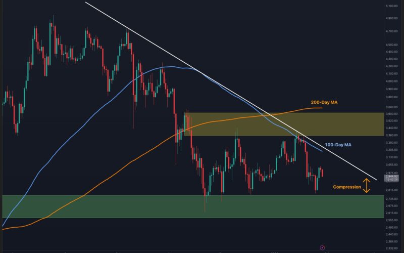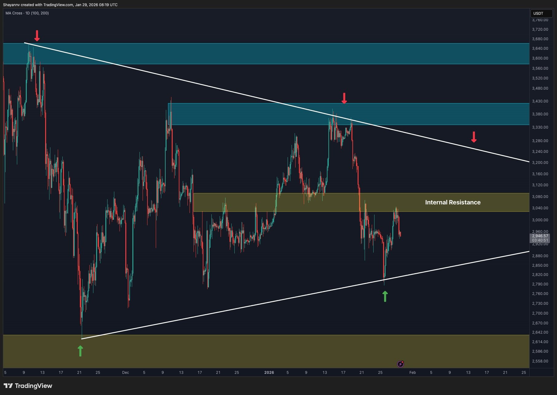 The overlapping resistance zone formed by the descending trendline and the moving averages has repeatedly absorbed bullish attempts, signalling persistent sell-side pressure at higher levels. At the same time, downside momentum has slowed as the price approaches a clearly defined daily demand zone around the lower boundary of the structure at the $2.7K price range. This area has previously triggered strong reactions, suggesting that buyers remain active and willing to defend these levels.