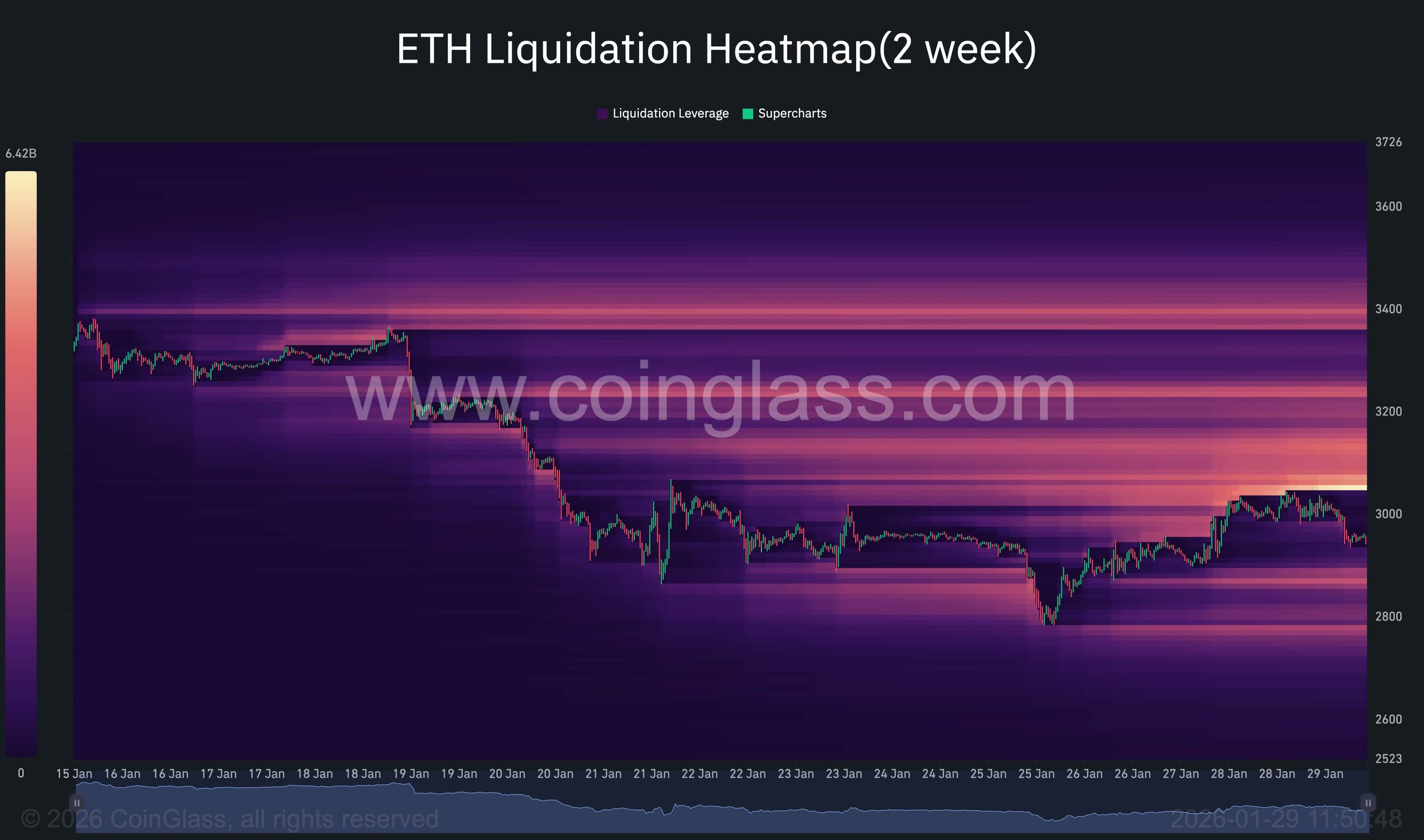 The liquidation heatmap highlights dense liquidity clusters resting above the current price at the $3.1K region, with particularly heavy concentrations overhead. This suggests that a move into resistance could trigger cascading liquidations on the short side, while downside sweeps into lower liquidity pools may be used to rebalance positioning before any larger directional push.