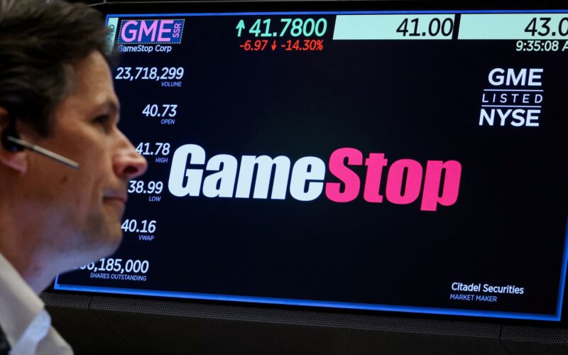 A trader works as a screen displays the trading information for GameStop on the floor at the New York Stock Exchange.