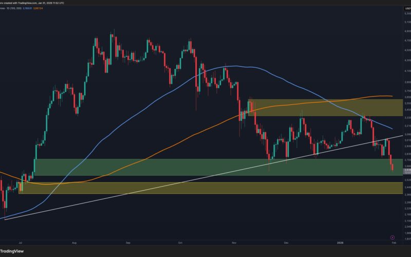 The asset has since accelerated lower and is currently testing a well-defined demand zone around the $2.5K area. This zone has previously acted as a strong buyers’ base, and the current reaction suggests initial demand absorption. However, the overall structure remains weak as long as the price stays below the moving averages and the $3K psychological level.