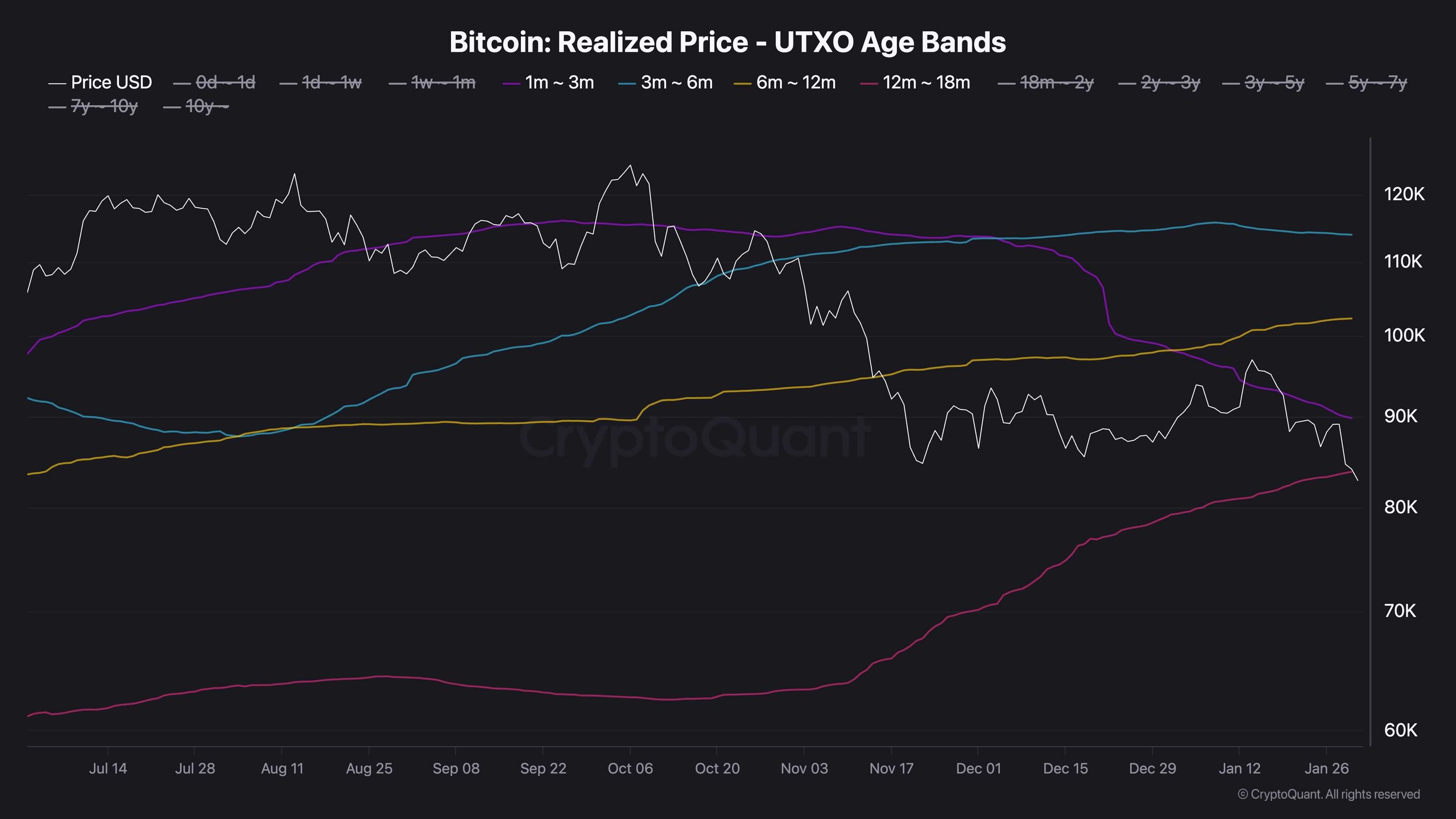 On the on-chain side, the Realized Price – UTXO Age Bands reveal an important shift in behavior. Longer-term holders remain relatively stable, while shorter-term cohorts show signs of stress as the price trades closer to their realized levels.