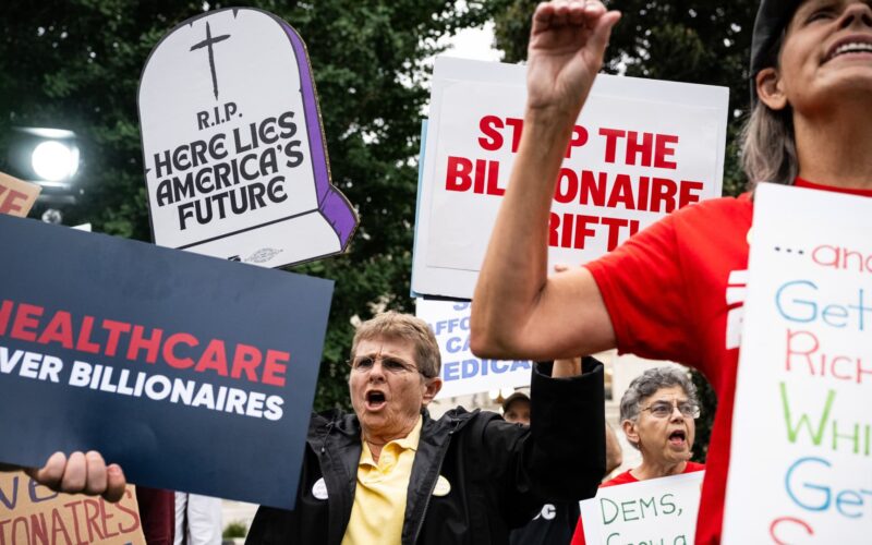 Demonstrators hold signs during a rally for healthcare funding outside the US Capitol in Washington, DC, on Sept. 30, 2025.