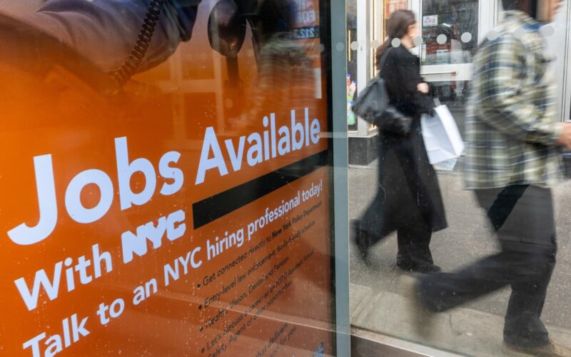 A ‘help wanted’ advertisement is displayed in Manhattan on Jan. 9, 2026, in New York City.
