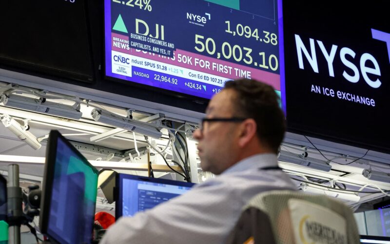 A trader works as the Dow Jones Industrial Average surpasses the 50,000 mark on the floor at the New York Stock Exchange (NYSE) in New York City, U.S., Feb. 6, 2026.