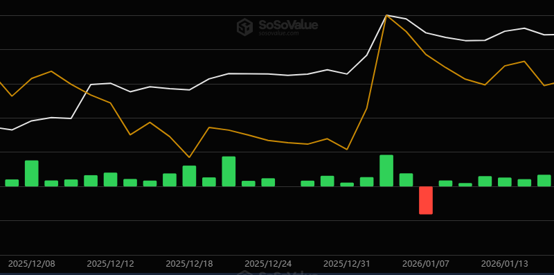 The investment vehicles have attracted significant interest, and cumulative net inflows have surpassed $1.23 billion. In the past several days (despite the market’s turbulence), the netflows remained positive. In fact, the last day with a red candle was January 29.