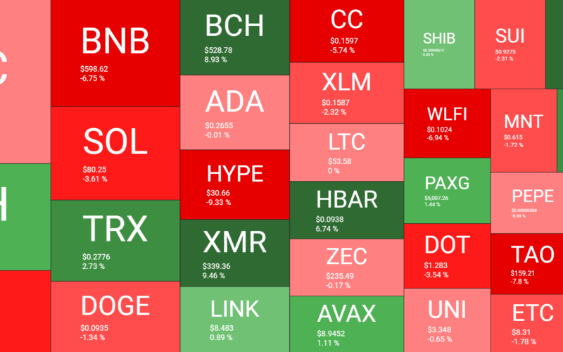 On the one hand, XRP, BNB, HYPE, and SOL are deep in the red, but on the other, BCH, XMR, and HBAR have surged by up to 9.5%.