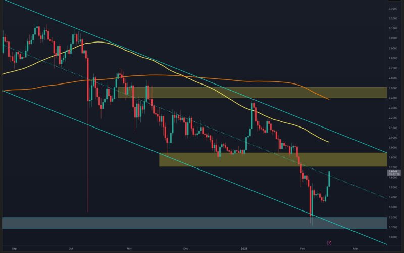 However, the rebound is now approaching the channel’s middle trendline , a prior breakdown region near $1.75–$1.85, which previously acted as support and has now flipped into resistance. As long as the asset remains below this $1.80 region, the broader bias stays corrective within a bearish trend. A daily close above $1.85 would open the path toward the next major supply at $2.40–$2.50, while rejection from this zone could send the price back toward $1.20 again.