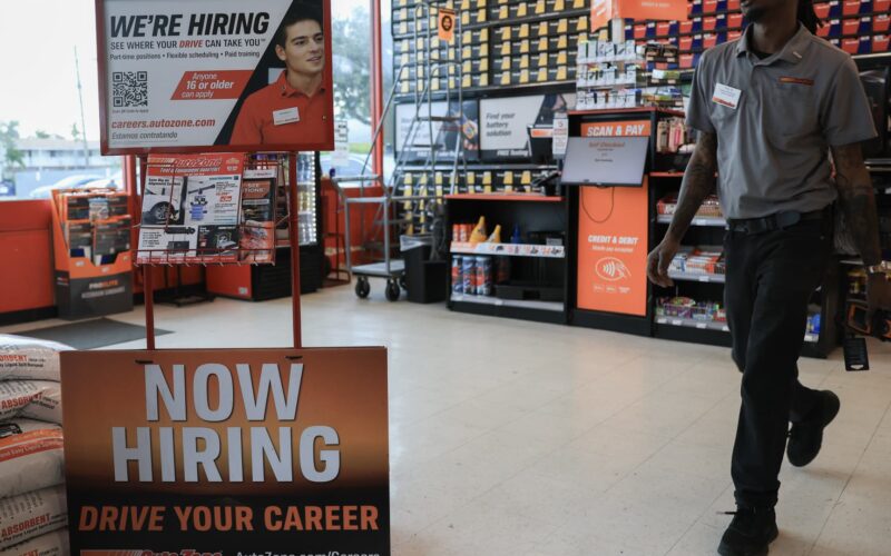 A “Now Hiring” sign is seen at an AutoZone on Feb. 11, 2026 in Hollywood, Florida.