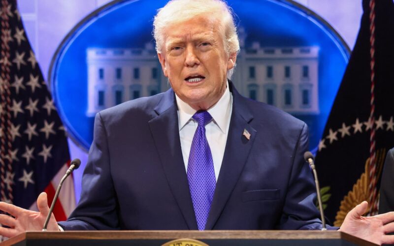U.S. President Donald Trump gestures as he speaks during a press briefing at the White House, following the Supreme Court’s ruling that Trump had exceeded his authority when he imposed tariffs, in Washington, D.C., U.S., January 20, 2026.