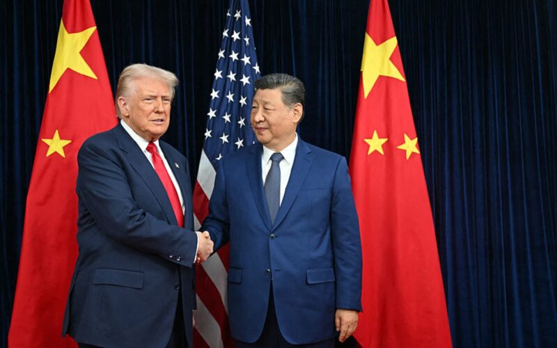 US President Donald Trump (L) and China’s President Xi Jinping shake hands as they arrive for talks at the Gimhae Air Base, located next to the Gimhae International Airport in Busan on October 30, 2025. Donald Trump and Chinese leader Xi Jinping will seek a truce in their bruising trade war on October 30, with the US president predicting a “great meeting” but Beijing being more circumspect. (Photo by ANDREW CABALLERO-REYNOLDS / AFP) (Photo by ANDREW CABALLERO-REYNOLDS/AFP via Getty Images)