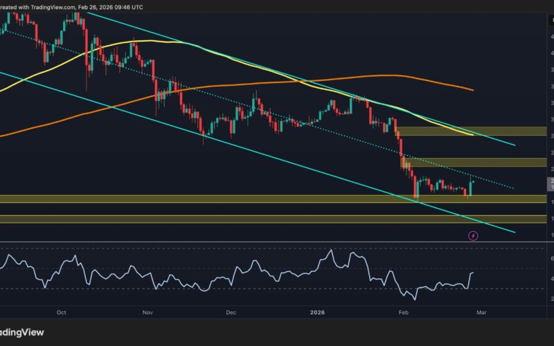 The bounce from this support has pushed RSI out of oversold territory and carried the price back toward the mid-line of the channel, but ETH still sits below the major resistance cluster formed by the $2,300–$2,400 supply zone, while the declining 100-day (yellow) and 200-day (orange) moving averages remain overhead.