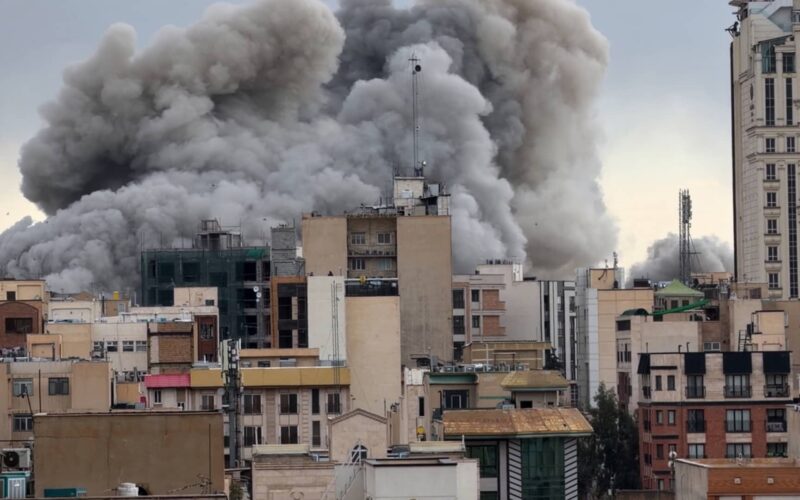 A plume of smoke rises after a strike in Tehran, Iran, Monday, March 2, 2026.