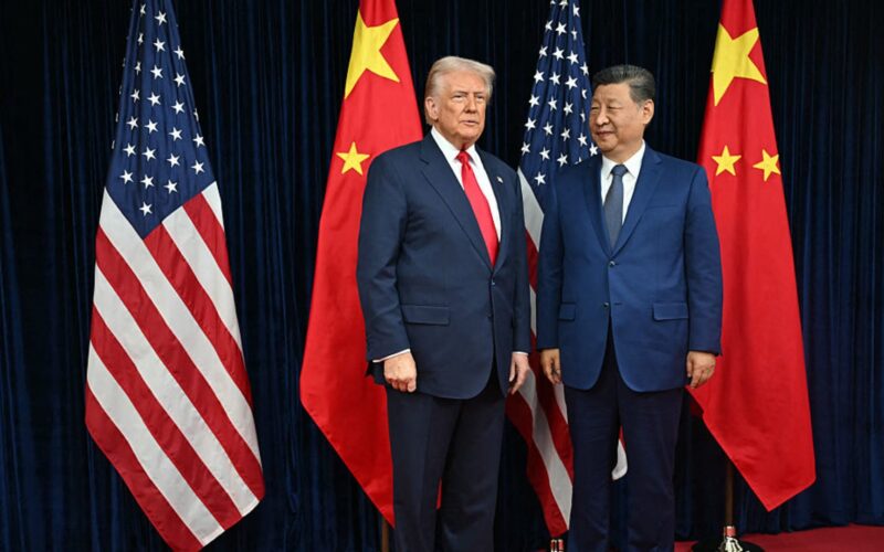 TOPSHOT – US President Donald Trump (L) and China’s President Xi Jinping arrive for talks at the Gimhae Air Base, located next to the Gimhae International Airport in Busan on October 30, 2025. Donald Trump and Chinese leader Xi Jinping will seek a truce in their bruising trade war on October 30, with the US president predicting a “great meeting” but Beijing being more circumspect. (Photo by ANDREW CABALLERO-REYNOLDS / AFP) (Photo by ANDREW CABALLERO-REYNOLDS/AFP via Getty Images)