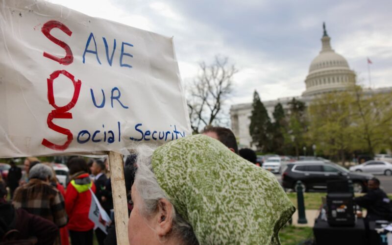 A person holds a sign reading ‘Save Our Social Security’ in support of fair taxation near the U.S. Capitol in Washington, D.C. on April 10, 2025. Tax justice advocates attended a rally to speak out against President Trump’s tax cuts for the wealthy, and to urge members of Congress to intervene.