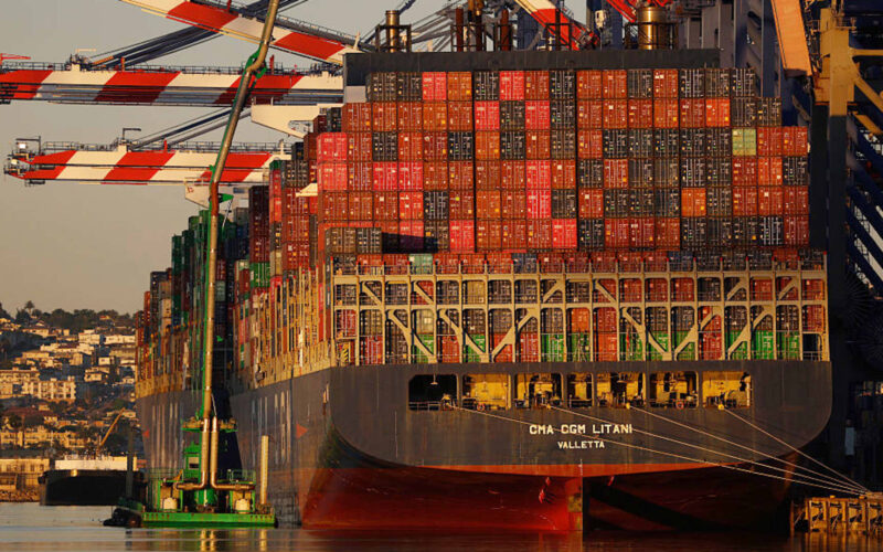 A container ship is seen docked at the Port of Los Angeles on March 13, 2026 in Los Angeles, California.