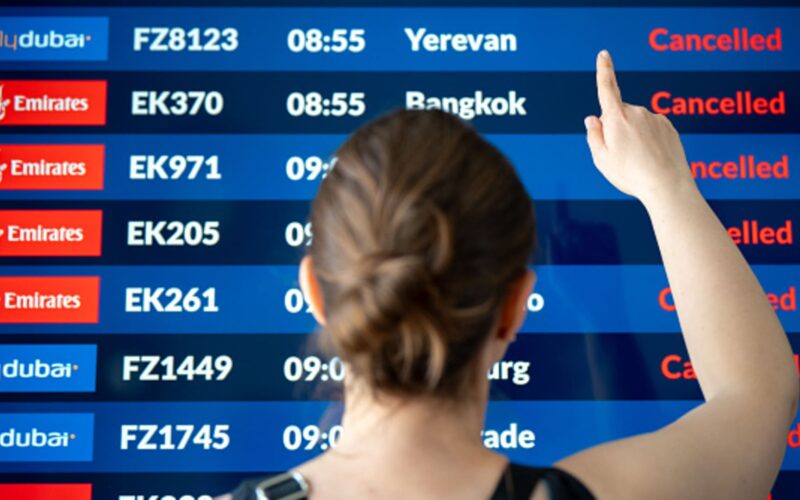 A traveler checks her flight status on the airport arrivals and departures board in Krakow, Poland, March 5, 2026.