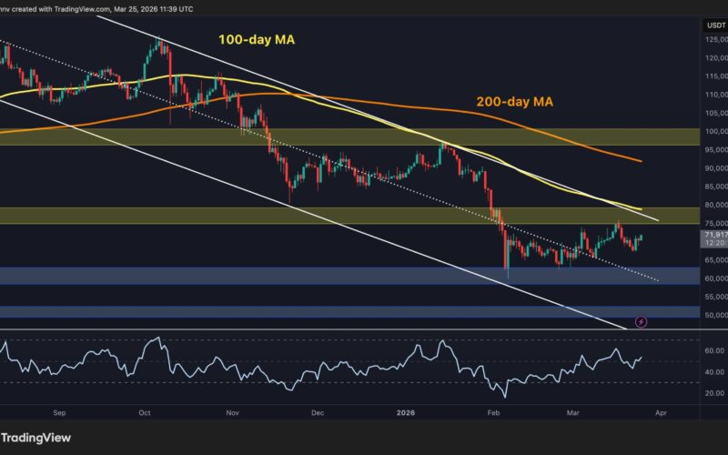 The RSI on this timeframe has also bounced from the low-30s and is trending upward above 60, suggesting short-term buying pressure is building. A decisive break above the triangle’s upper trendline and the $75K resistance band would be a meaningful short-term bullish signal, while a breakdown below $62K would likely send the price below the February support zone and continue the overall downtrend.