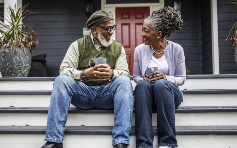 Senior couple having coffee in front of suburban home