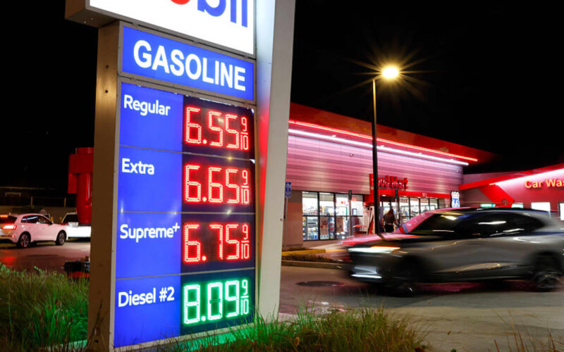 Gas prices are displayed at a Mobil gas station on March 30, 2026 in Pasadena, California.