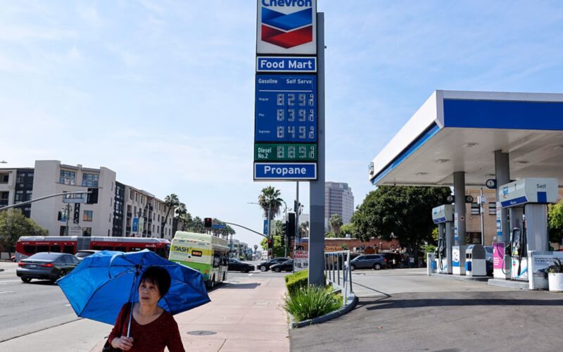 High gas prices are displayed at a gas station on April 9, 2026 in Los Angeles, California.