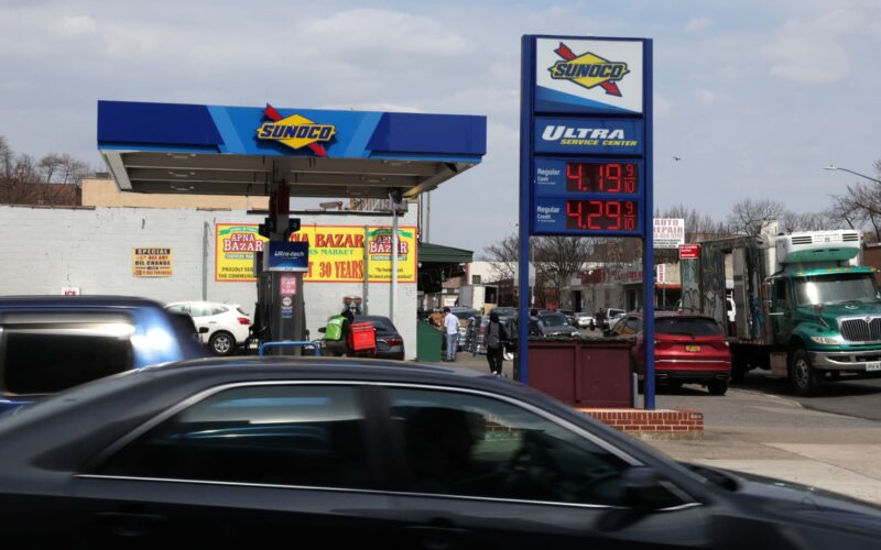 Gasoline prices are displayed at a Sunoco station in the Brooklyn borough of New York City, U.S., March 31, 2026.