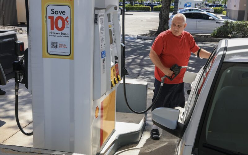 A customer pumps gas into their vehicle on Oct. 24, 2025 in Miami, Florida.