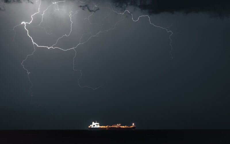 Lightning occurs when META 4, an Oil Products Tanker, sails into Muscat Anchorage on March 21, 2026 at Sultan Qaboos Port in Muscat, Oman.