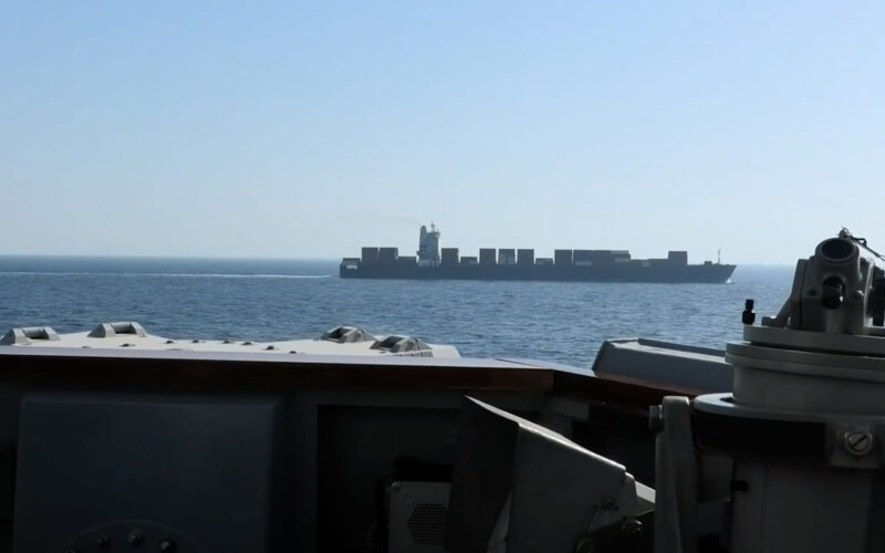 In this screen grab from a video released by U.S. Central Command, U.S. forces operating in the Arabian Sea enforced naval blockade measures against an Iranian-flagged cargo vessel attempting to sail toward an Iranian port on April 19, 2026 in the Arabian Sea.