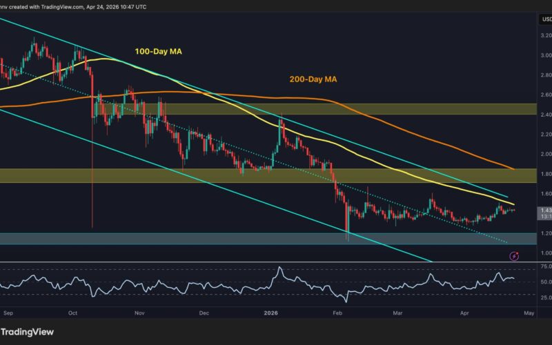The descending channel that has contained XRP since the late 2025 peaks remains unbroken, and the distance between the current price and any meaningful resistance continues to make the recovery thesis a difficult one to argue. The 100-day moving average has now declined to approximately $1.50, and the 200-day moving average sits near $1.80.