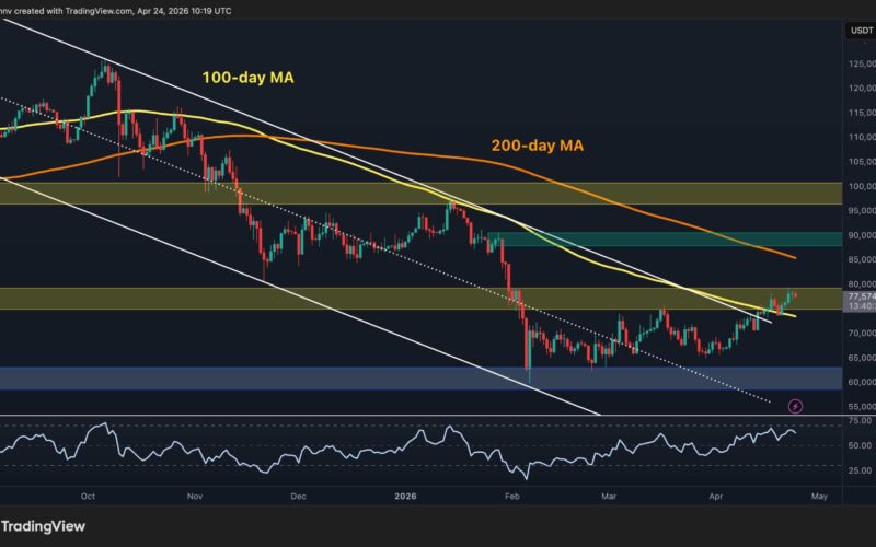 The descending channel that defined Bitcoin’s structure from October 2025 through early April is now firmly behind the price. The cryptocurrency has broken above it, cleared the 100-day moving average (~$74k), and is holding within the $75k–$80k resistance band, with the RSI trending higher around 60.